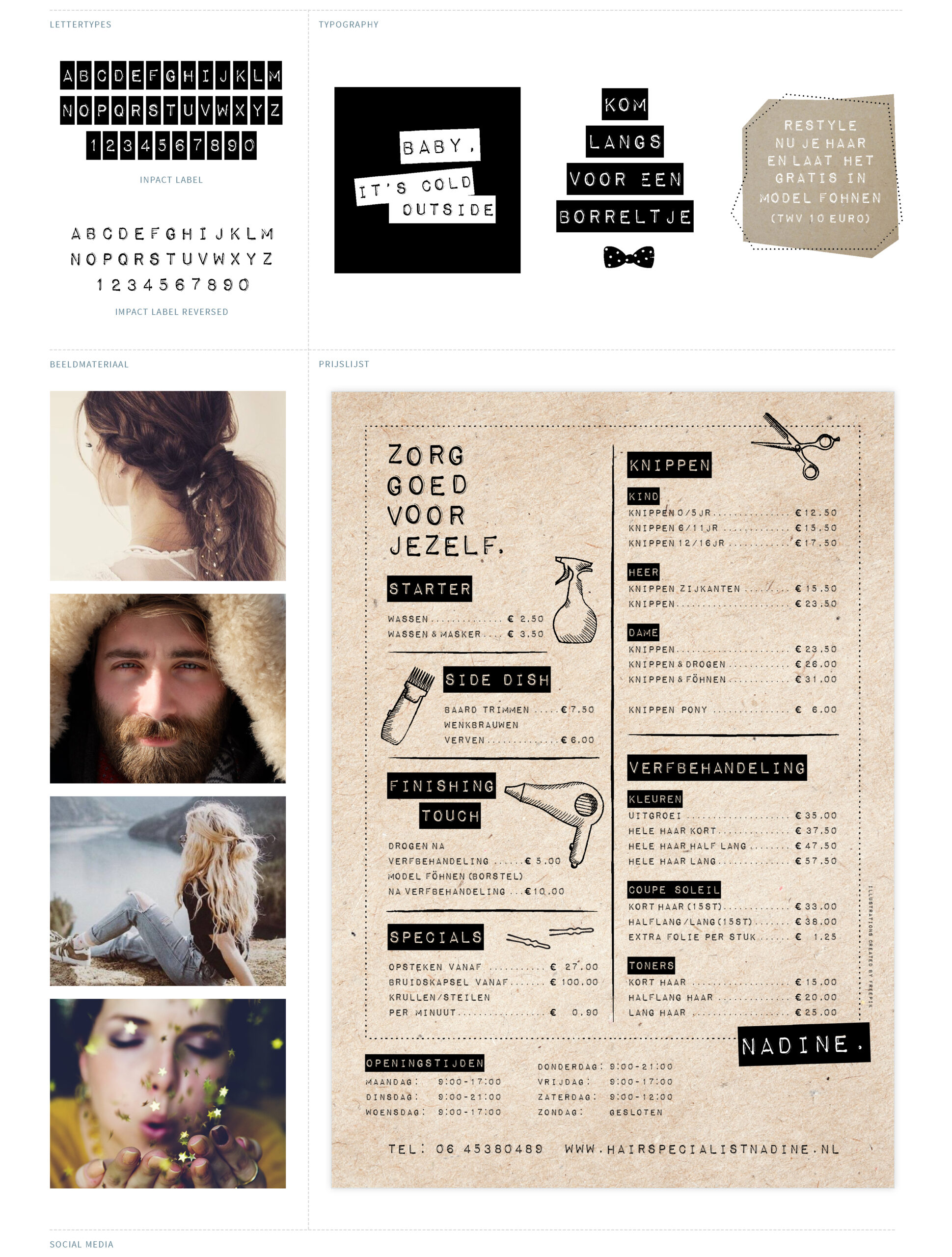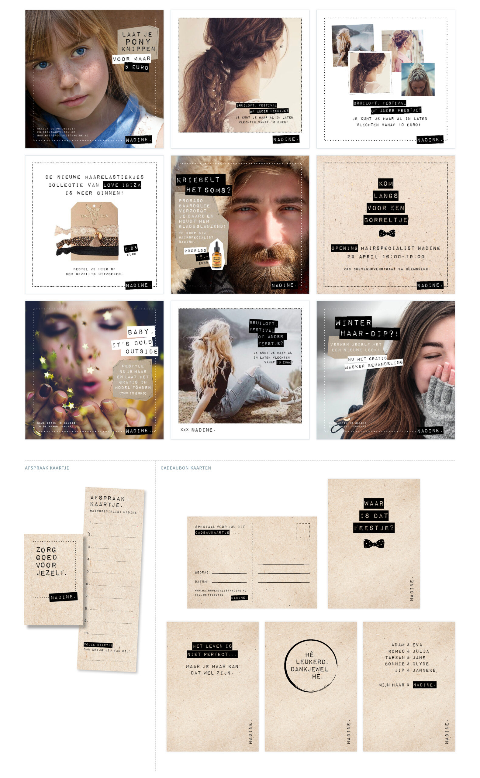 Een stoere huisstijl voor Nadine. Inclusief afspraken kaartje, een prijslijst, cadeaukaarten en social media posts.
