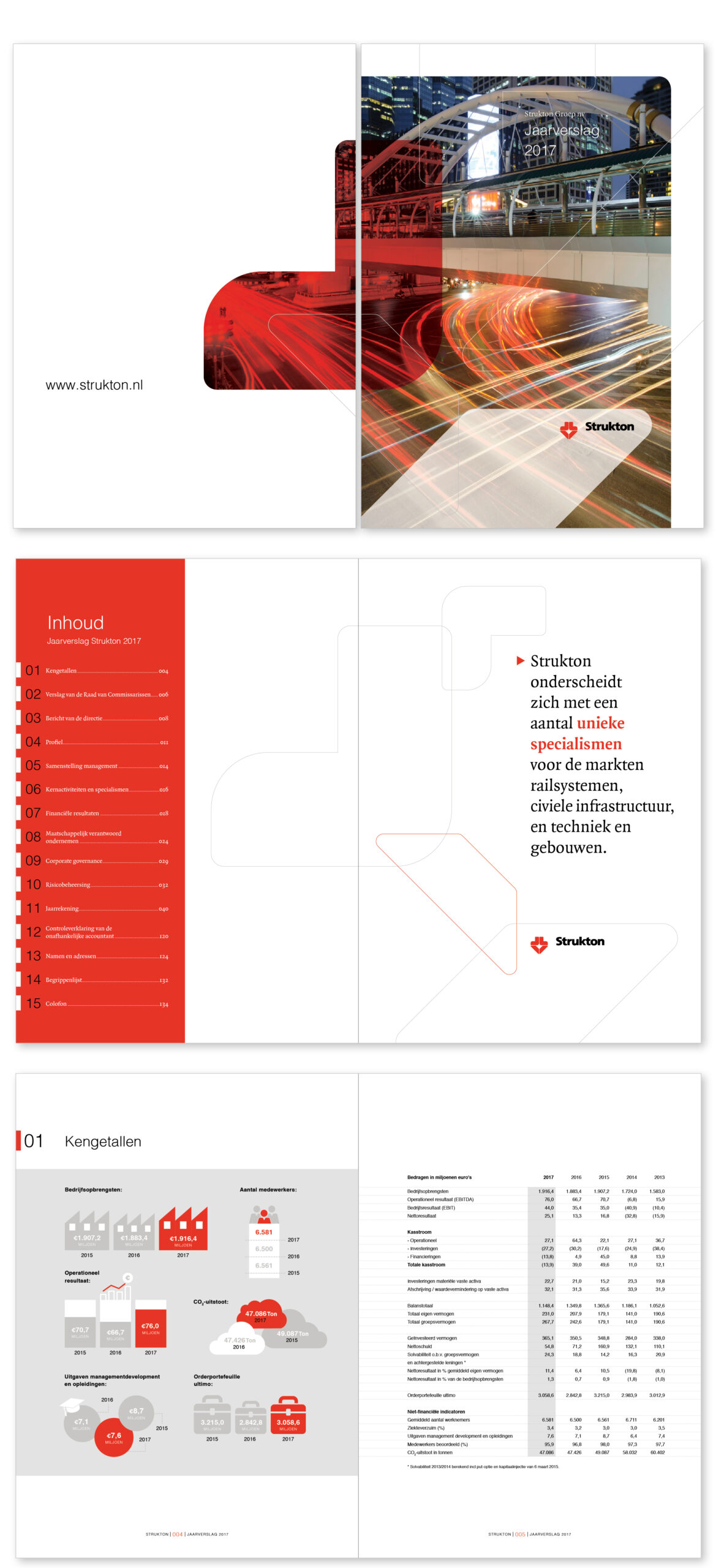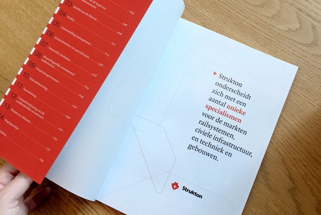 Strukton had de wens om hun jaarverslag in een nieuw jasje te steken. Hiervoor heb ik ontwerpen aangedragen. Ze waren content met de concepten dus ik kon vervolgens aan de slag met de inhoud van het verslag. Er is een Nederlandse en Engelse versie gemaakt en gedrukt in veelvoud.